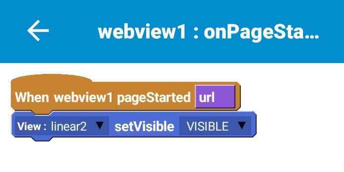 7. In webview1 onPageStarted event, make linear2 VISIBLE.